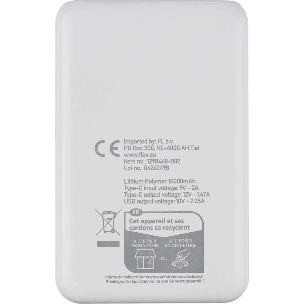 Újrahasznosított ABS anyagból készült powerbank 20 000 mAh kapacitással és 22,5 W gyors töltési teljesítménnyel. Type-C in/out és Type-A bemenettel, LED visszajelzővel és biztonsági védelmekkel. A hátoldalon gravírozott recycled (újrahasznosított) alapanyagra utaló logó található. Selyempapírral bélelt barna dobozba csomagolva.