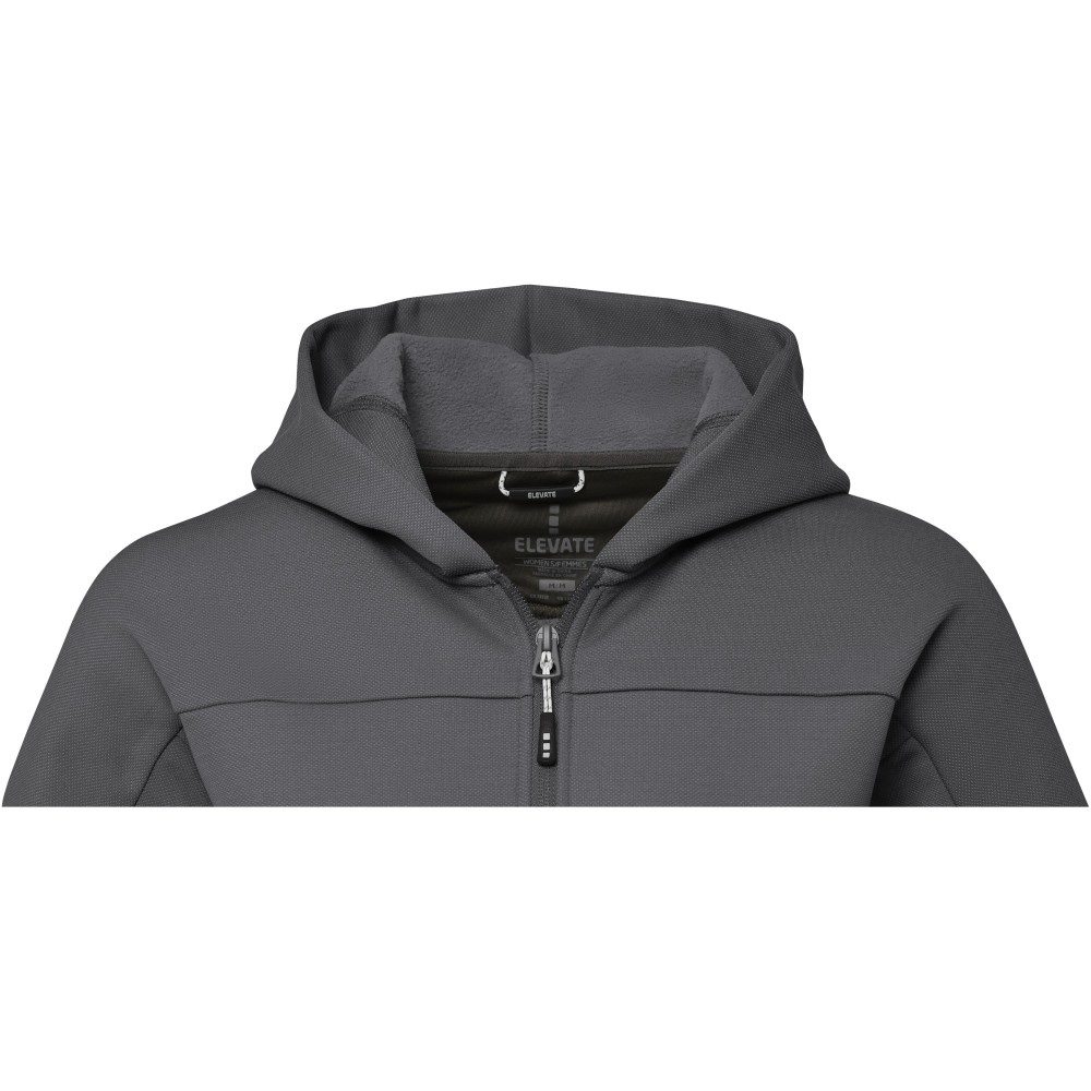 Középen elöl fordított cipzár. Elülső zsebek. Márkázott akasztó. Szatén nyakszalag. Belső médiakimeneti port kábelvezetővel. Félhold betét a nyaknál. Kötött 70% poliészterből és 30% Sorona ( r) anyagból, 245 g/m2.