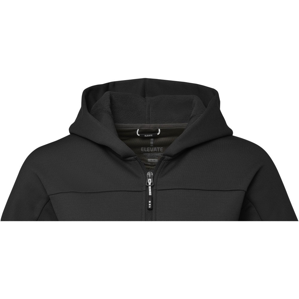 Középen elöl fordított cipzár. Elülső zsebek. Márkázott akasztó. Szatén nyakszalag. Belső médiakimeneti port kábelvezetővel. Félhold betét a nyaknál. Kötött 70% poliészterből és 30% Sorona ( r) anyagból, 245 g/m2.