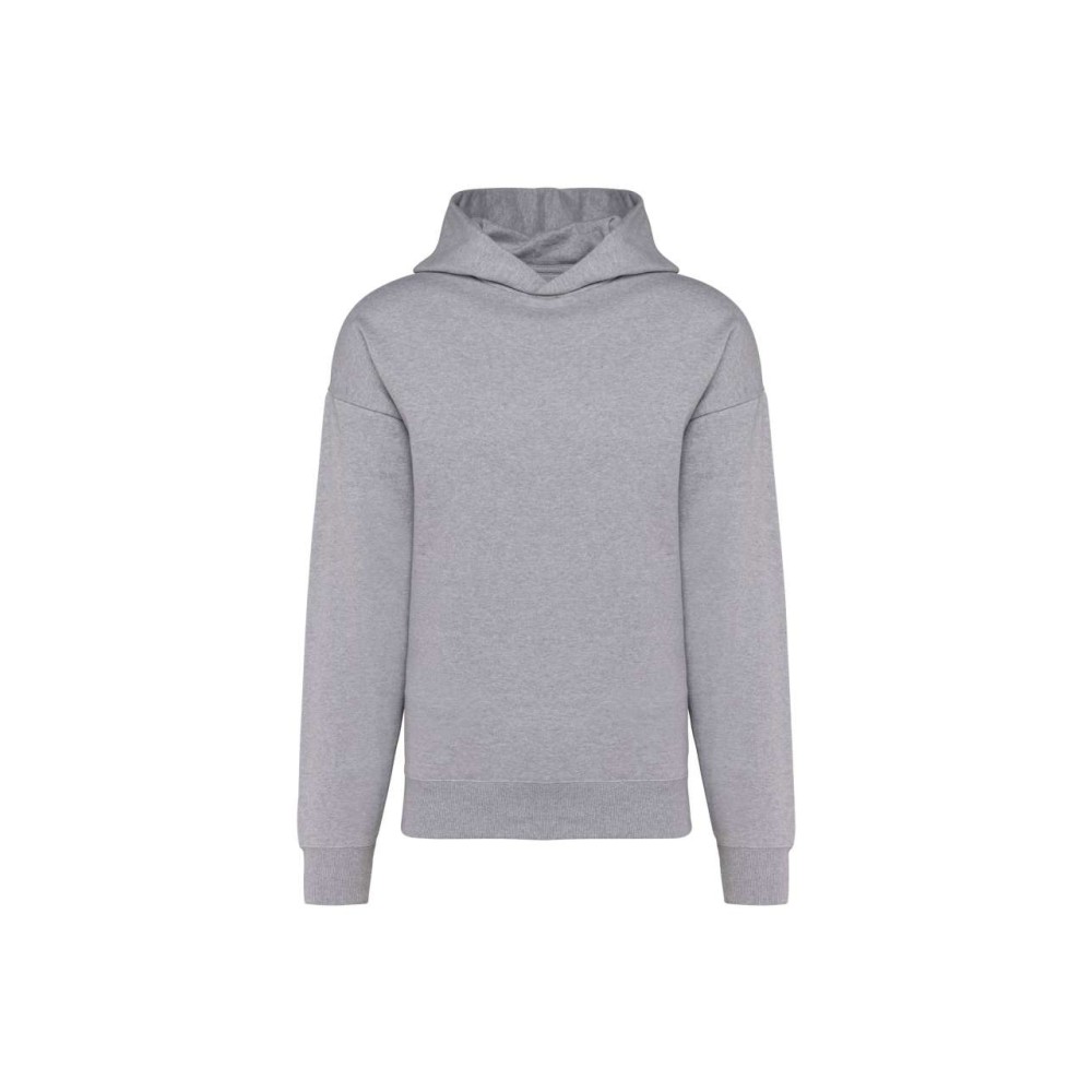 80% cotton / 20% polyester. Oversized fit with dropped shoulders. Brushed fleece. Carded cotton. 1x1 ribbing with a tubular finish on the cuffs and hem. Hidden pocket with invisible zip in the seam on the right side when worn. Cotton hood with double dart. Elastane in the ribbing on the cuffs and at the bottom of the garment to prevent them from going out of shape. Matching twill taped neck. Half-moon finish inside neck. Double overlaid overstitching on cuffs and bottom hem. No brand label on the collar. only a size tag for easy decoration.
