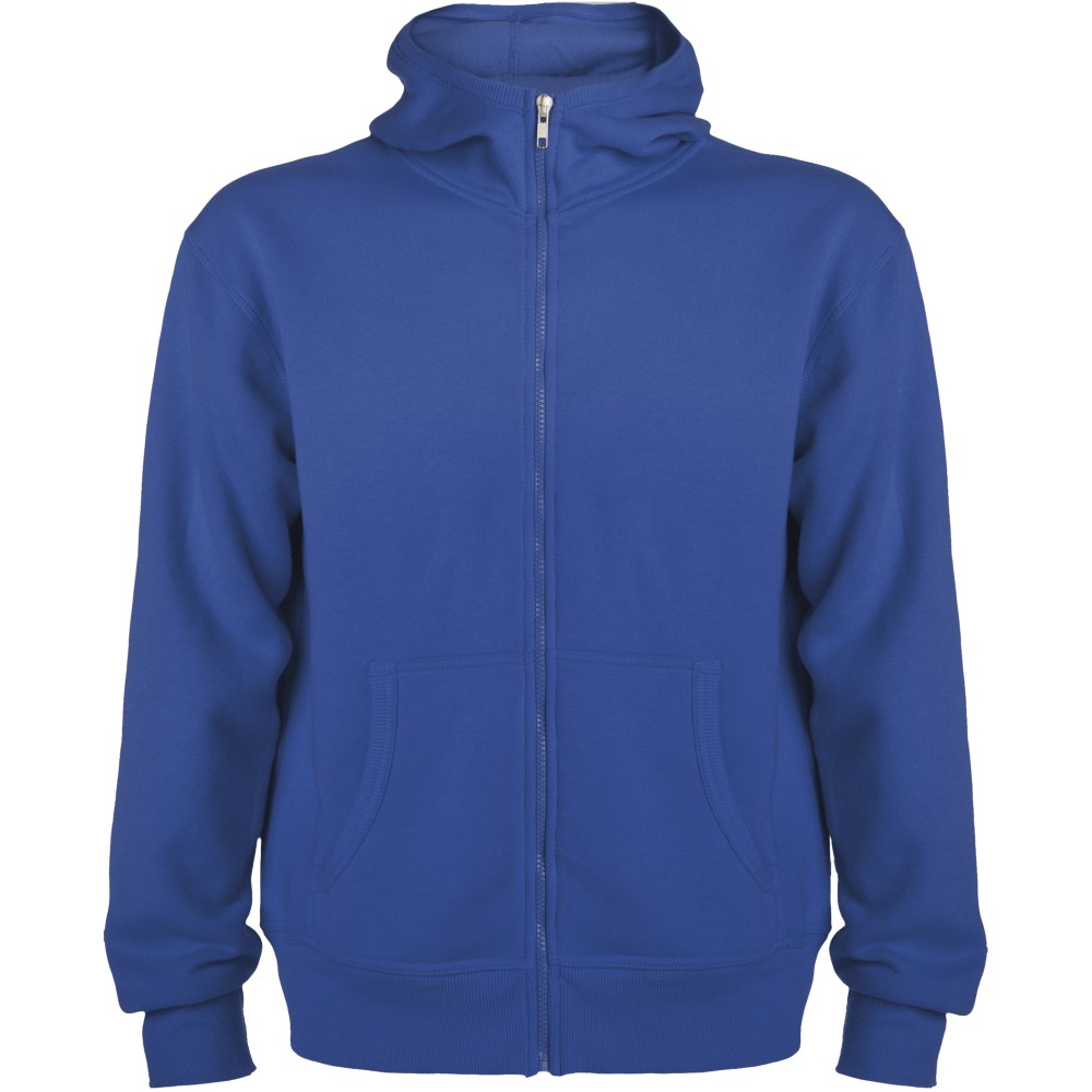 Magasnyakú, kapucnis pulóver teljes cipzárral. Bordázott részletek a kapucni és a zsebek szélén. Kenguru stílusú zseb. 2x2-es bordás kézelő és nyakpasszé. Gyerekméretekben is kapható. 50% pamut és 50% poliészter, 280 g/m2.