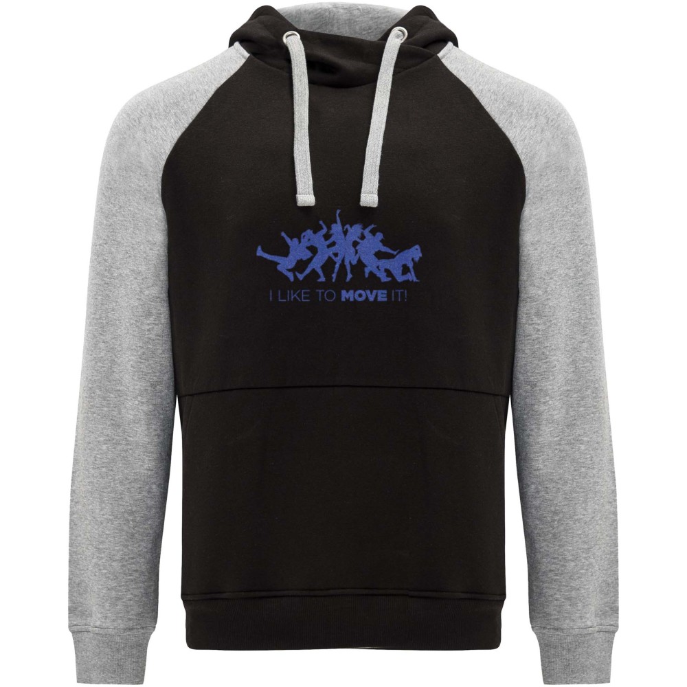 Két színű uniszex kapucnis pulóver. Kapucni keresztezett nyakrésszel és fém kiegészítőkkel. Kontrasztos belső rész a kapucnin, húzózsinór és raglán ujjak. Kenguru zseb. Rugalmas 1x1 passzék és alj. Levehető címke.