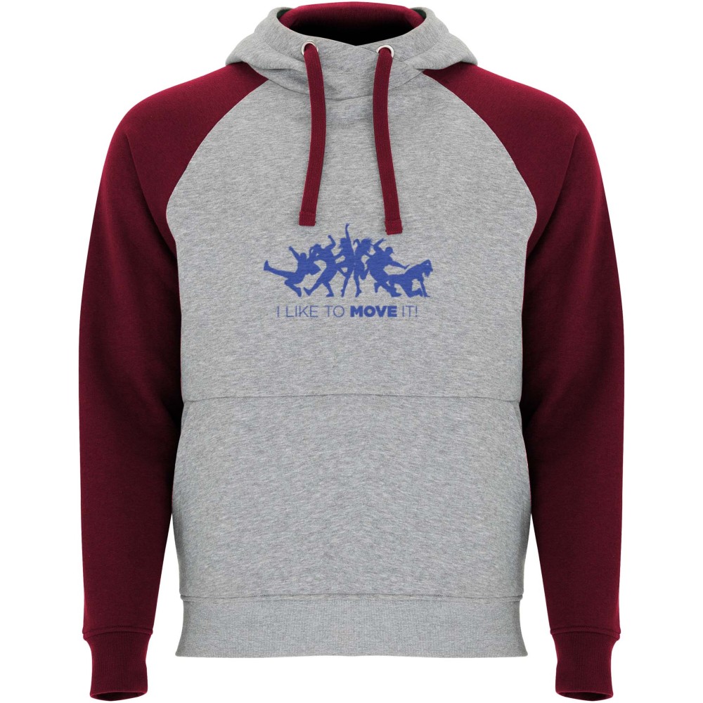 Két színű uniszex kapucnis pulóver. Kapucni keresztezett nyakrésszel és fém kiegészítőkkel. Kontrasztos belső rész a kapucnin, húzózsinór és raglán ujjak. Kenguru zseb. Rugalmas 1x1 passzék és alj. Levehető címke.