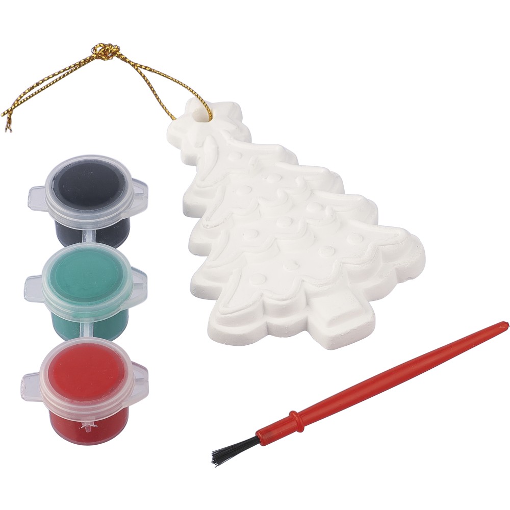 Karácsonyfa festőkészlet, amely tartalmaz egy gipszfigurát, három különböző színű akrilfestéket és egy ecsetet. A figurát a rajta található lyukon keresztül poliészter zsinórral lehet karácsonyfadíszként felakasztani.