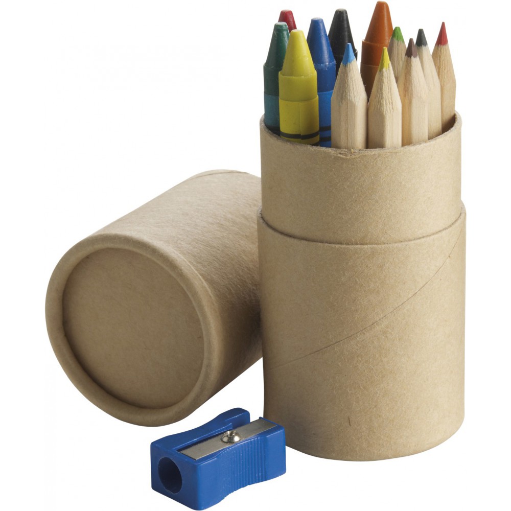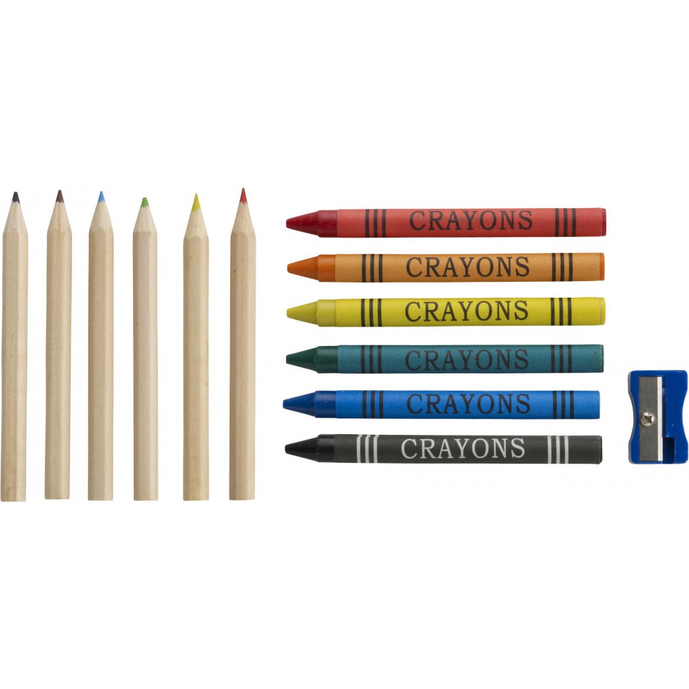 Rajzkészlet. Tartalma: 6 db színesceruza, 6 db zsírkréta, hegyező, kartondobozban.