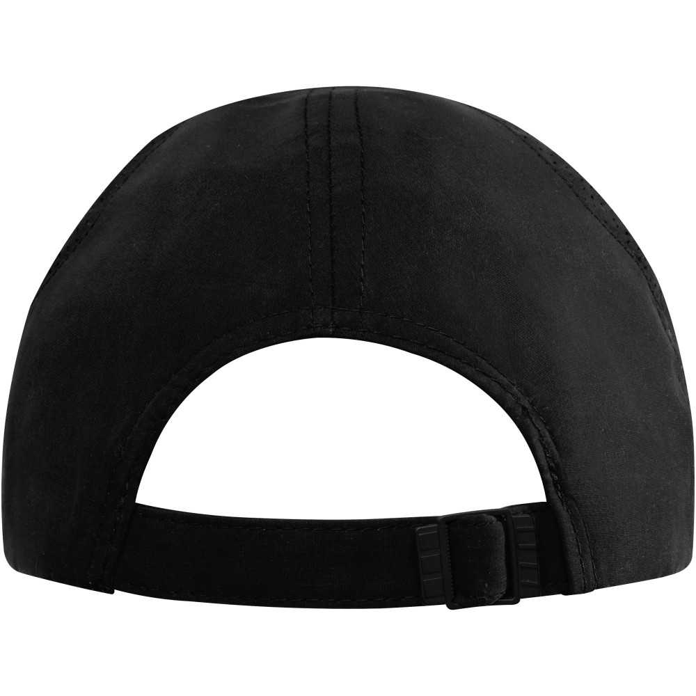 Újrahasznosított poliészterből készült, GRS tanúsítvánnyal rendelkező baseballsapka fém csattal. Lézeres technikával vágott szellőzőkkel rendelkezik. 110 g/m2.