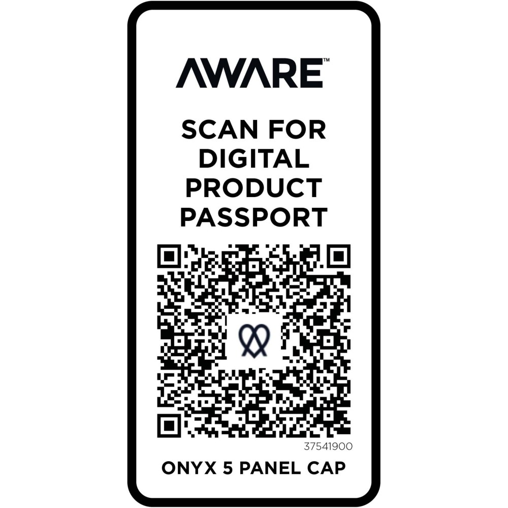 Az Onyx 5 paneles sapka 70%-ban újrahasznosított pamutból és 30%-ban újrahasznosított poliészterből készült. Úgy tervezték, hogy 58 cm-es fejkörfogatnál kényelmesen illeszkedjen, a fémcsatos záródás pedig könnyű és biztonságos beállítást tesz lehetővé. A sapka Cyclo újrahasznosított szálakat tartalmaz, ahol előválogatott hulladékot használnak, amely meghatározza a fonal színét. Ezek a szálak nem csak a szűz erőforrások iránti igényt csökkentik, hanem a körkörös élet iránti elkötelezettséget is mutatják, megtestesítve a hulladékcsökkentés lényegét. Minden sapkához egy Aware nyomjelző is tartozik. Ez az innovatív funkció lehetővé teszi a felhasználók számára, hogy egy QR-kód segítségével nyomon követhessék a termék eredetét és útját, növelve az ellátási lánc átláthatóságát, és elősegítve a termék és a gyártási folyamat közötti szorosabb kapcsolatot.