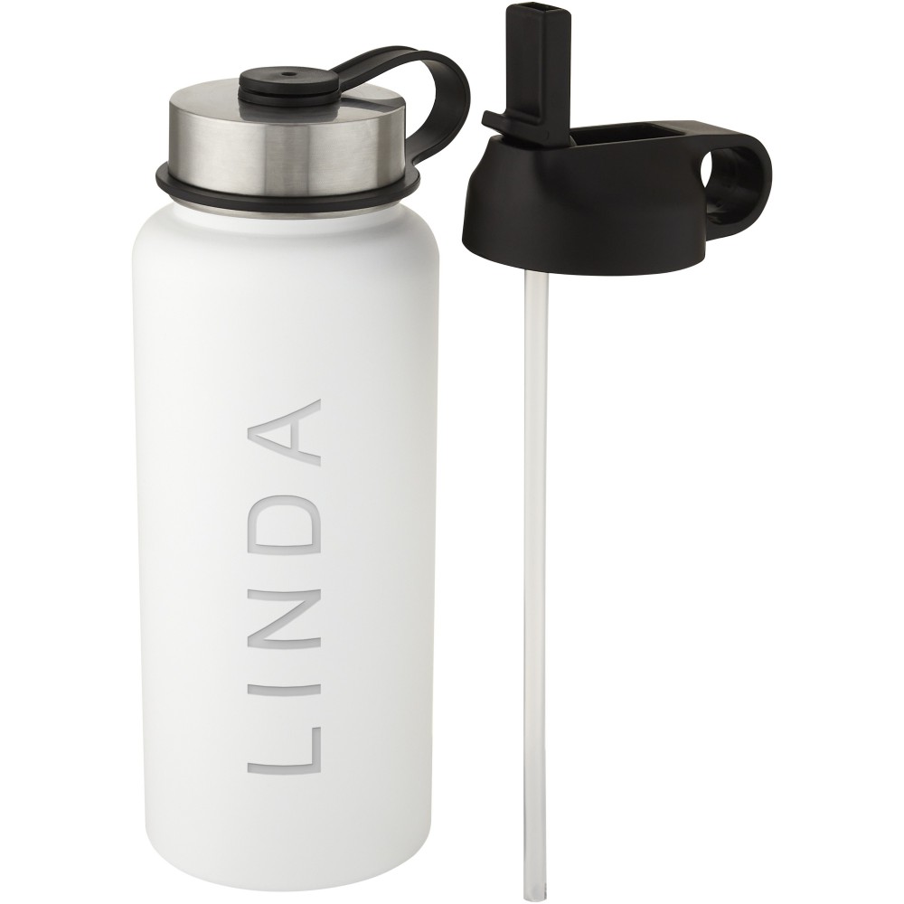Kettő az egyben duplafalú, rozsdamentes acél sportpalack réz vákuumszigeteléssel, 2 fedéllel: egy szívószálas fedél és egy felcsavarható fedél hurokkal. A szigetelt 18/8-as rozsdamentes acél konstrukció megakadályozza a páralecsapódást a palack külső oldalán, a divatos matt bevonat pedig extra tartóssá teszi. Szélesen nyíló száj a könnyű feltöltéshez, kiöntéshez és tisztításhoz. BPA-mentes, a német élelmiszerbiztonsági törvény (LFGB) szerint tesztelt és jóváhagyott. Ftaláttartalomra tesztelve és jóváhagyva a REACH előírásai szerint. Jégkockákhoz tökéletes. Szivárgásmentes. Szénsavas italokkal nem használható. Mosogatógépben nem mosható és mikrohullámú sütőben történő melegítésre nem alkalmas. Nagy űrtartalmú palack: 1L. Újrahasznosított karton díszdobozban.