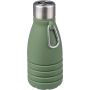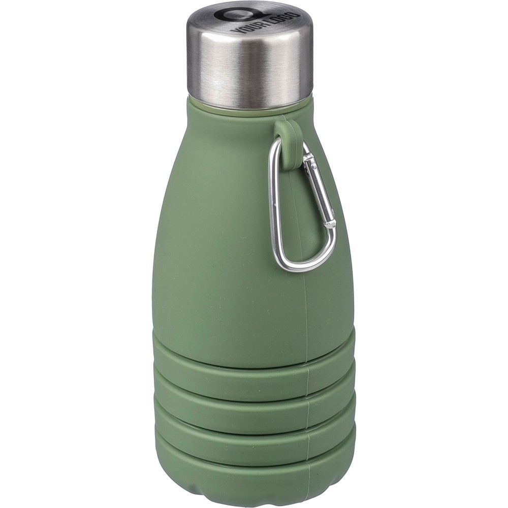 Összecsukható palack rozsdamentes acél fedéllel és alumínium karabinerrel. Összecsukott méret: d: 7x17 cm, kinyitott méret: d: 7x25 cm. Nincs egyenként csomagolva. Anyaga: szilikon. Űrtartalom: 550 ml.