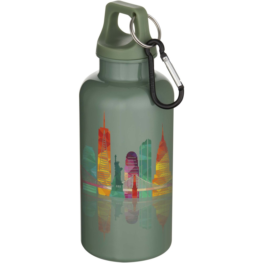 Az RCS tanúsítvánnyal rendelkező RPET-ből készült, tartós, mégis könnyű, 400 ml-es kulacs lehetővé teszi a folyamatos hidratálást. Tökéletes kísérő sportoláshoz, kirándulásokhoz vagy irodai használatra. A szimplafalú Oregon palack csavaros kupakkal rendelkezik, és bőséges felületet kínál bármilyen logó elhelyezésére. A mellékelt karabiner segítségével (mely mászásra nem alkalmas) a kulacs biztonságosan táskához rögzíthető. A termék megfelel az EFSA által jóváhagyott PET újrahasznosítási szabályoknak.
