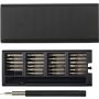 Csavarhúzókészlet 24 heggyel. A nyelében mágnes segíti a hegyek kezelését. A végén lévő gomb megnyomásával a hegyeket tartó tok kinyílik. ABS műanyag és fém.