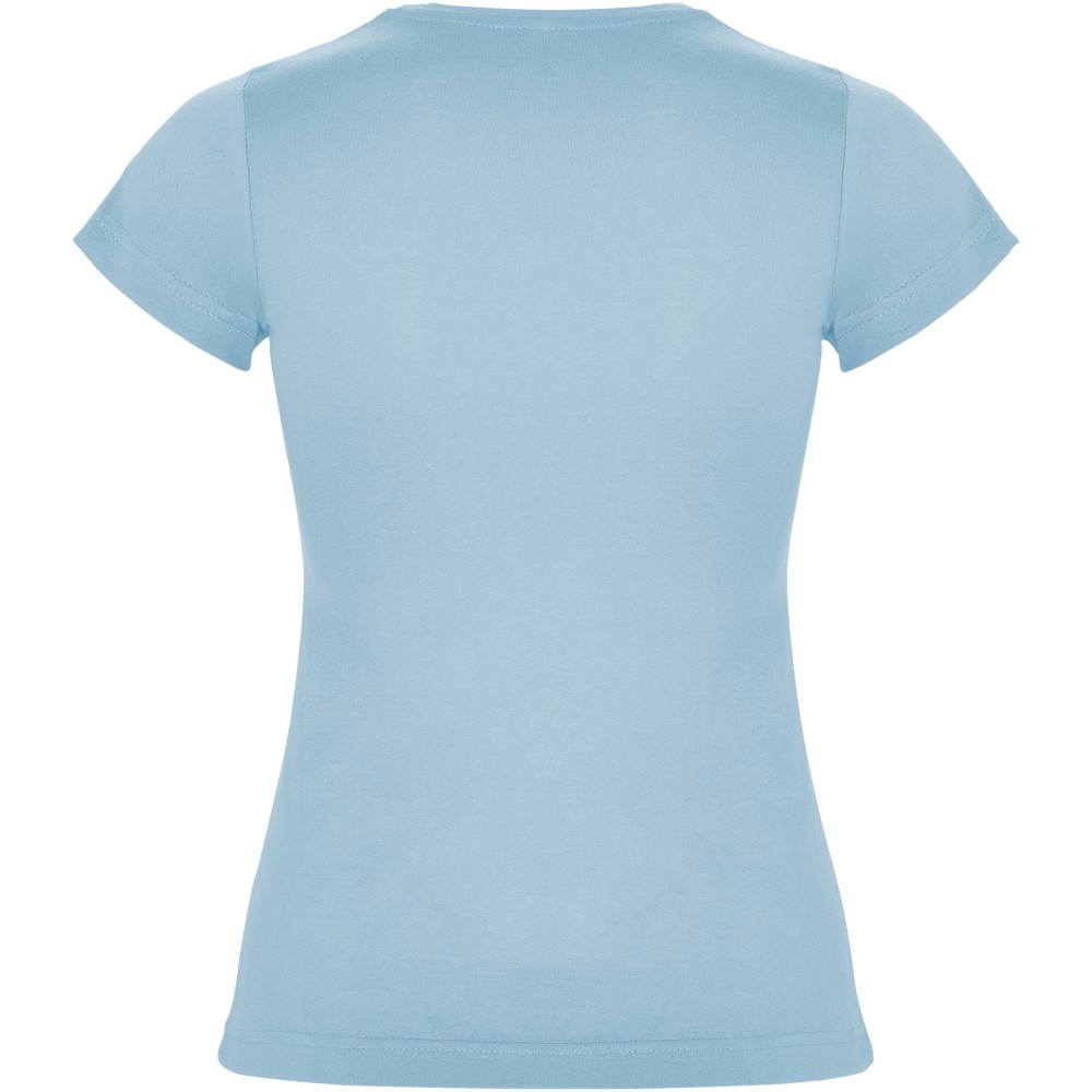 Rövidujjú, karcsúsított, oldalvarrott női póló. 1x1 dupla rétegű bordás nyak és válltól vállig tartó fedett varratok. 100% pamutból készült, 155 g/m2 súlyú, egyrétegű Jersey kötés.