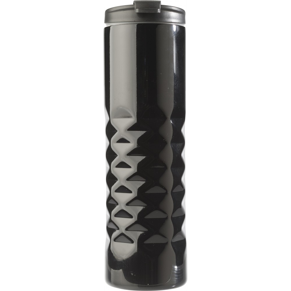 Duplafalú termoszbögre gyémánt mintázattal. Nem szivárgásmentes. Mosogatógépben nem tisztítható. 460 ml. Rozsdamentes acél és BPA-mentes műanyag.