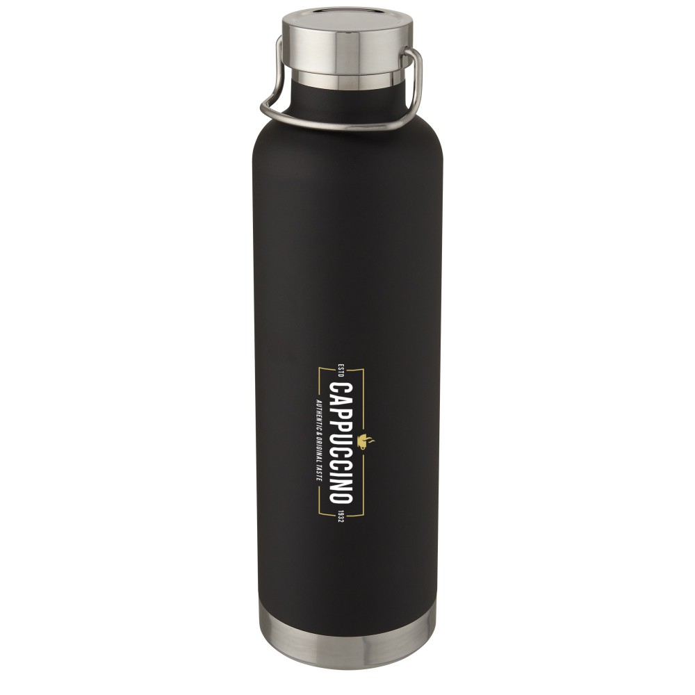 Nagy, duplafalú sportpalack 18/8-as rozsdamentes acél vákuumkonstrukcióval és rézszigeteléssel, amely több órán keresztül melegen vagy hidegen tartja az italokat. A konstrukció megakadályozza a páralecsapódást a palack külső oldalán, és a trendi porfújt bevonat extra tartóssá teszi. Rozsdamentes acél, csavaros fedél tartós, rozsdamentes acél fogóval. Széles nyílás a könnyű feltöltéshez, öntéshez és tisztításhoz. BPA-mentes, a német élelmiszerbiztonsági törvény (LFGB) szerint tesztelt és jóváhagyott. Ftaláttartalomra tesztelve és jóváhagyva a REACH előírásai szerint. Jégkockákhoz tökéletes. Szivárgásmentes. Szénsavas italokkal nem használható. Mosogatógépben nem mosható és mikrohullámú sütőben történő melegítésre nem alkalmas. Űrtartalom: 1 l. Újrahasznosított karton díszdobozban.