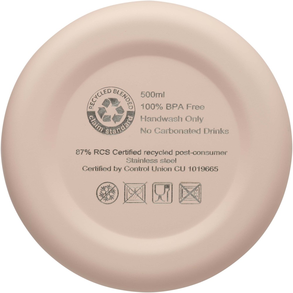 Rézvákuum szigetelésű, RCS tanúsítvánnyal rendelkező rozsdamentes acél palack letisztult dizájnnal. Az szigetelt rozsdamentes acél szerkezet megakadályozza a kondenzációt a palack belsejében, és a trendi matt porfestett felület extra tartóssá teszi. BPA-mentes, német élelmiszerbiztonsági jogszabály (LFGB) szerint tesztelt és jóváhagyott. Ftalát-tartalom szerint REACH szabályozásoknak megfelelően tesztelt és jóváhagyott. Űrtartalom: 500 ml. Kézi mosogatás javasolt. Újrahasznosított kartondobozban szállítjuk.