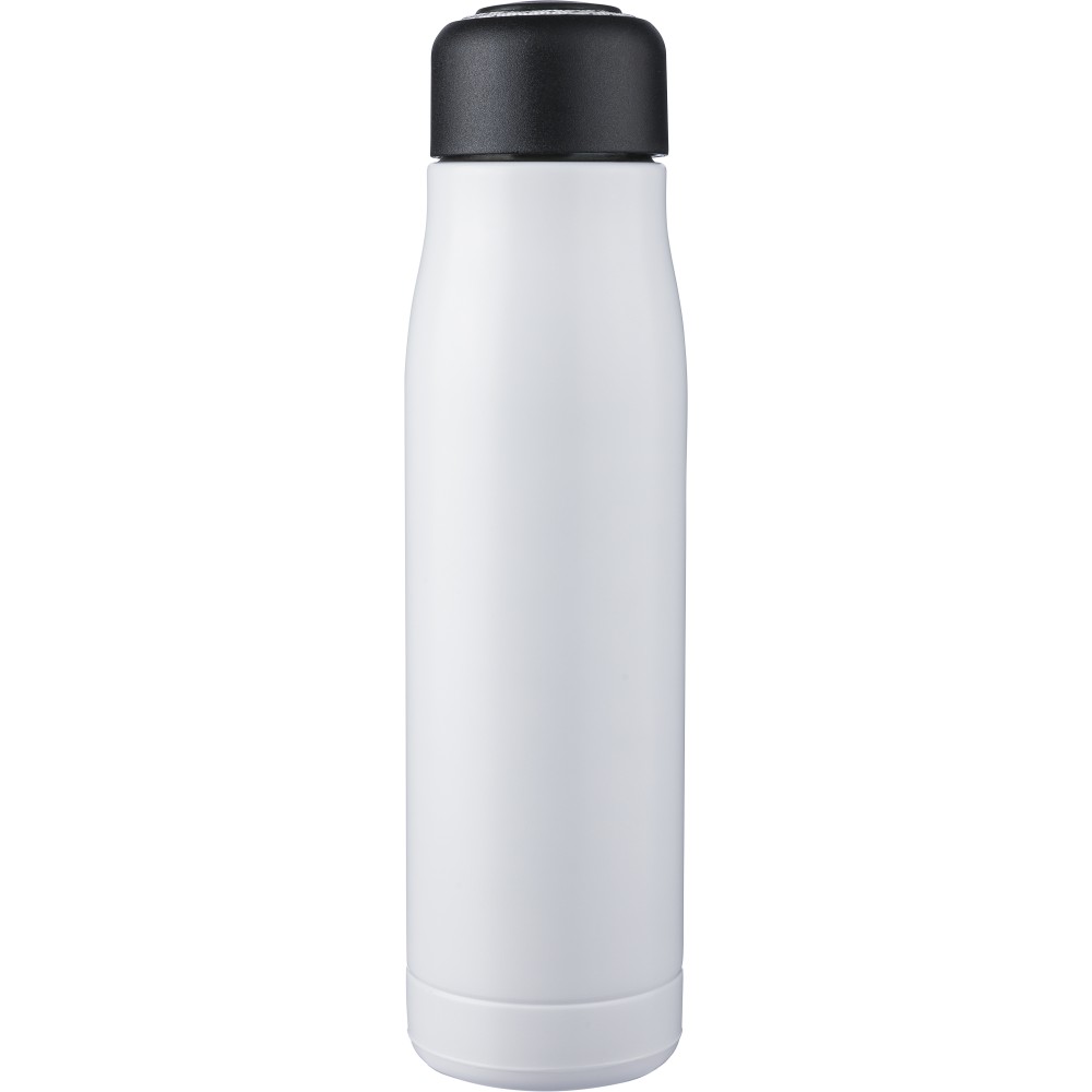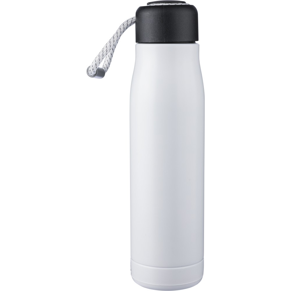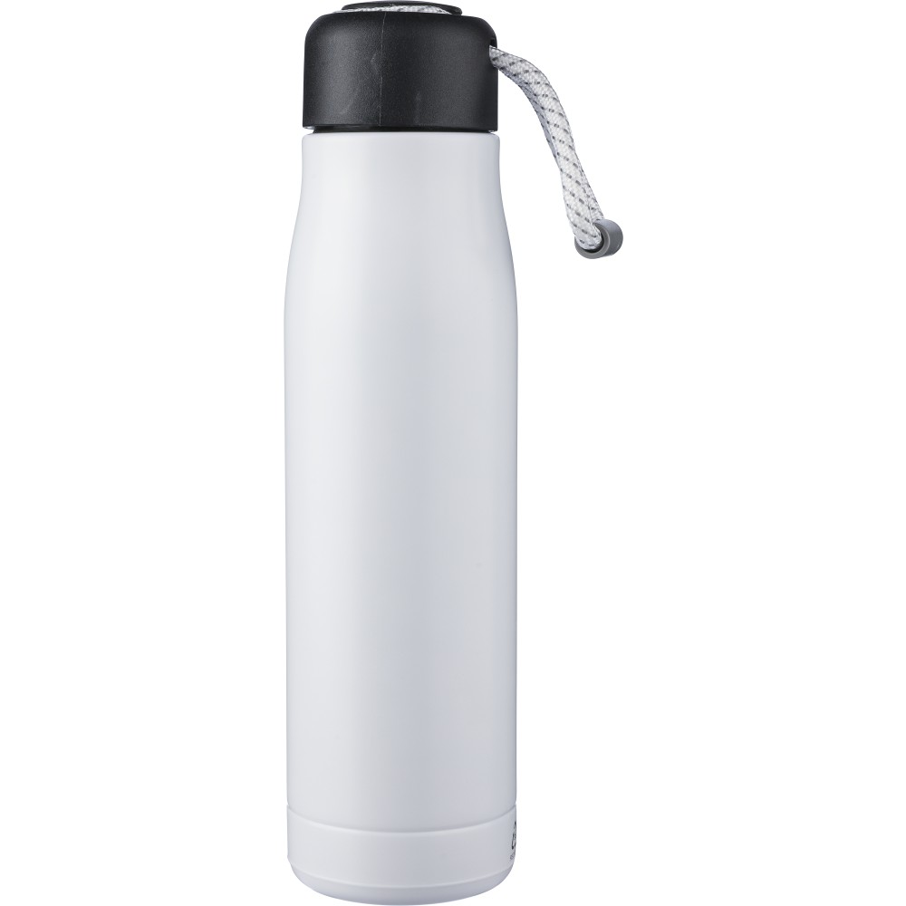 Újrahasznosított rozsdamentes acélból készült duplafalú, vákuumszigetelt termosz, 500 ml-es. Belseje 304-es, külseje 201-es rozsdamentes acél. Csavaros PP kupakkal, poliészter hordozópánttal. Hőszigetelésre és mindennapos használatra tervezve. Az újrahasznosított anyagra utaló gravírozott logóval. Csomagolása barna papírdoboz.