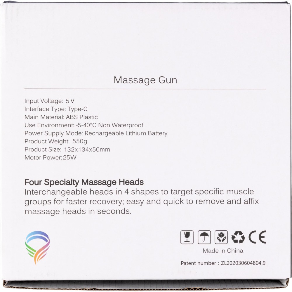 Masszázspisztoly (1.800-3.200 fordulat/perc) 1.200 mAh-s újratölthető akkumulátorral. 5 V bemenet és 6 intenzitási fokozat az izmok masszírozásához. Egyedi csomagolásban, darabonként díszdobozban, 4 masszázsfejjel érkezik.