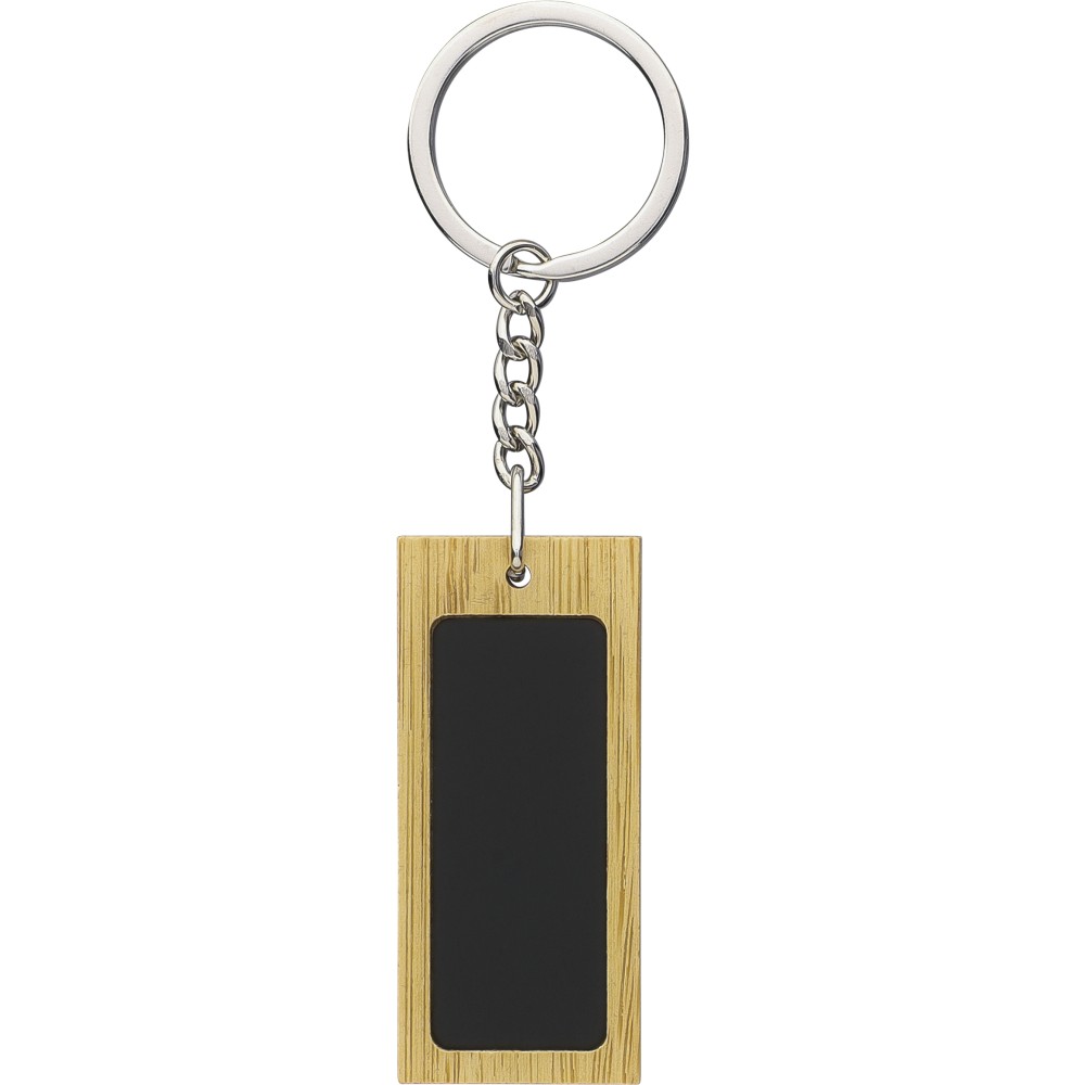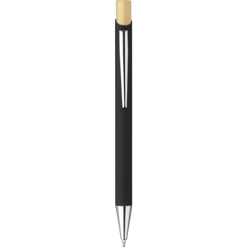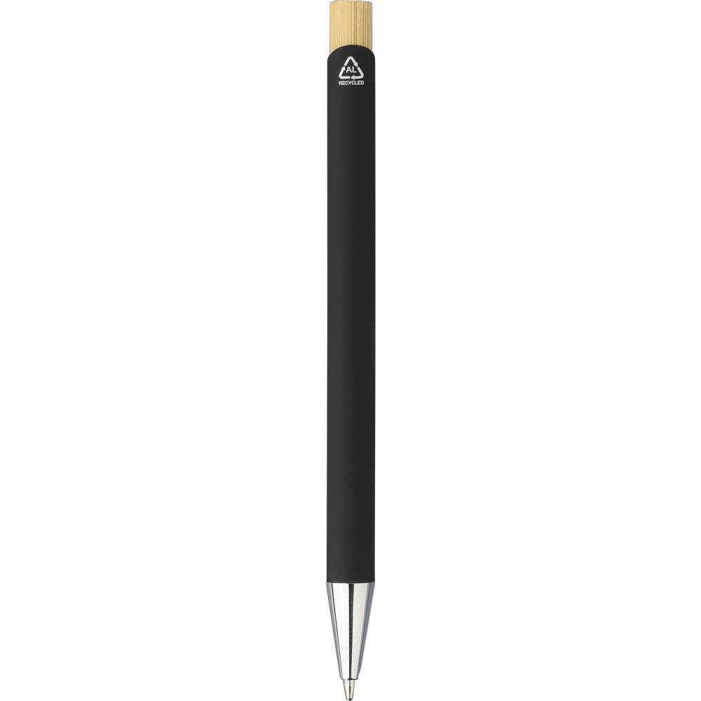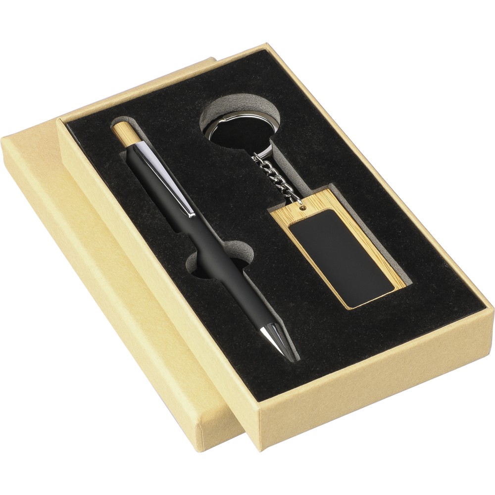 Bambusz írószerkészlet, amely egy bambuszból és gumírozott, újrahasznosított alumíniumból készült golyóstollat tartalmaz kék tintával, bambusz nyomógombbal és krómozott műanyag heggyel. Bambuszból és gumírozott rozsdamentes acélból készült téglalap alakú kulcstartóval. Mindkét termék lézergravírozás után tükörhatású, és újrahasznosított alumínium logóval van ellátva. Bársonyberakásos, kraftpapír dobozban csomagolva.