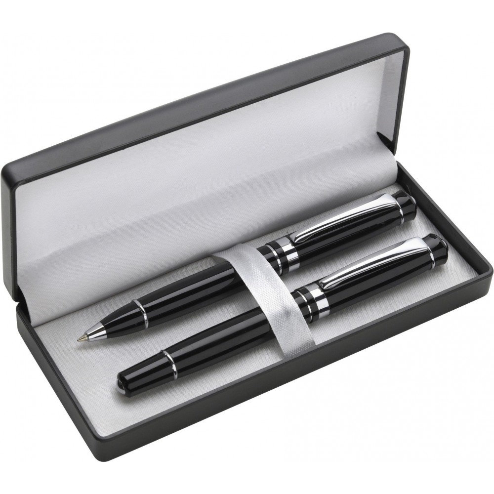 Alumínium tollkészlet. Golyóstoll és rollerball fekete tollbetéttel, díszdobozban.