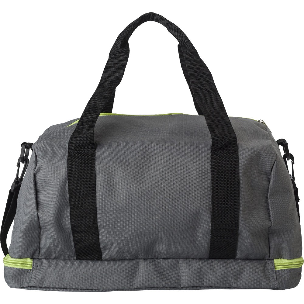 Kis sporttáska egy cipzáros zsebbel, cipőtartó rekesszel az aljában és állítható vállpánttal. 600D poliészter.