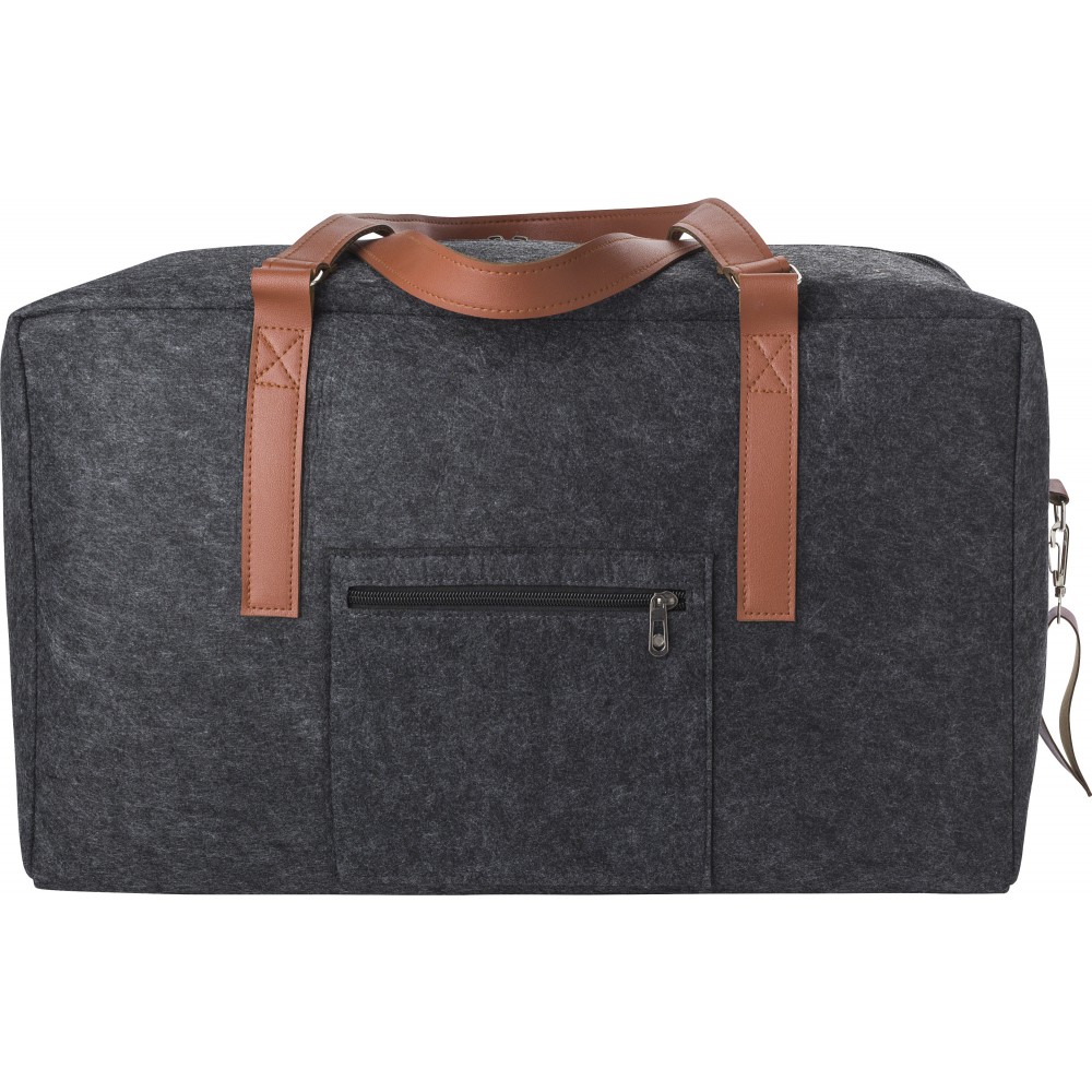 RPET filcből készült utazótáska PU részletekkel. Egy nagy rekesz cipzárral, kis zseb cipzár nélkül.